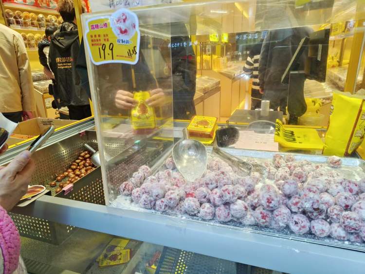 在一家栗子店的招牌上,“糖山楂”和“栗子”的字样十分显目,不少市民正在排队购买。这家栗子店只卖三样产品,分别是板栗、山楂和红薯片。据记者现场观察,15分钟内便有3位市民购买了“板栗+山楂”组合。