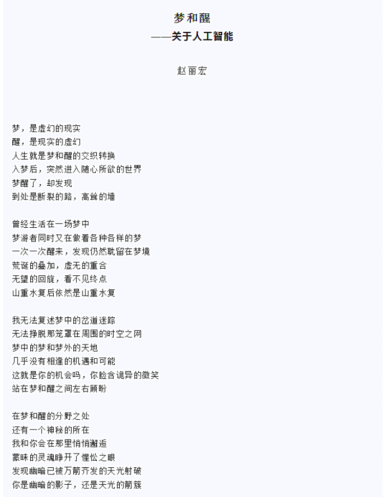 11月22日上午,上海国际诗歌节通过其官方微信公众号发布了特刊诗选,由上海市作协副主席、上海国际诗歌节艺术委员会主席赵丽宏在今年初秋刚刚创作的《梦和醒——关于人工智能》(点击见全文)。