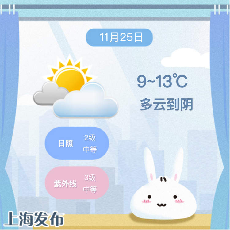 申城天气:今天阳光随机打卡,全天气温9~13℃ 周到君 2023-11-25 来源:周到上海 今天上海多云到阴,白天东部沿江沿海地区有短时小雨,东北风4-5级转偏东风3-4级。今天最高温度13℃,最低温度9℃,气温仍处低位,注意保暖。 明天受短波槽东移影响,有一次云系增多的过程,气温有所回升。 下周上海天气以晴或多云为主,伴有几波冷空气,气温也回升乏力,冬天的脚步越来越近了。 (内容综合自上海发布、上海市天气) 来源:周到上海 作者:周到君 赞一个 (0)