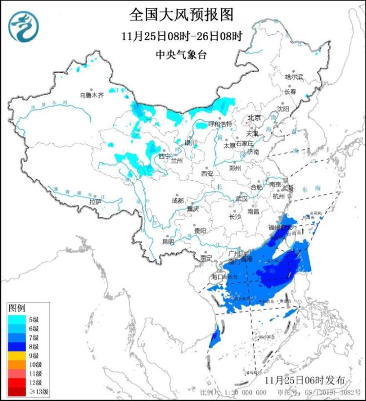 另外,公众还需关注大风的影响,预计今天,内蒙古中部、新疆北部、甘肃西部、青海中东部等地将有5~6级、阵风7级的大风;东海西南部海域、台湾海峡、台湾以东洋面、巴士海峡、南海北部和中部海域、南海西南部海域将有7~8级、阵风9级的大风。中央气象台今晨继续发布大风蓝色预警。