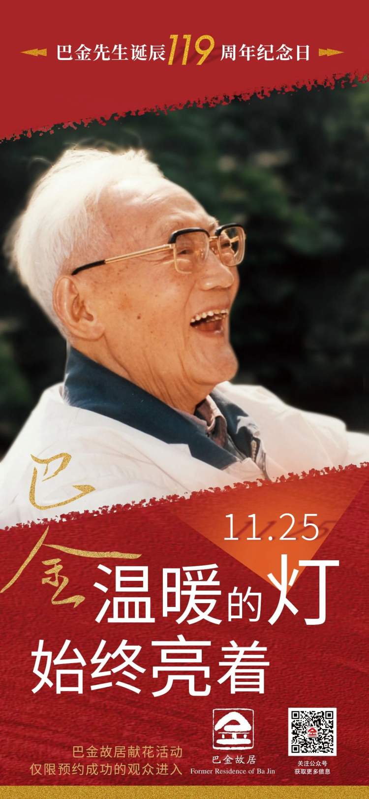 11月25日是巴金先生诞辰119周年纪念日,巴金故居的大门再次为他挚爱的读者开启。由于故居正在修缮期间,不能接待大客流的公众参观,这次巴金故居仅向线上预约成功的119名观众开放。