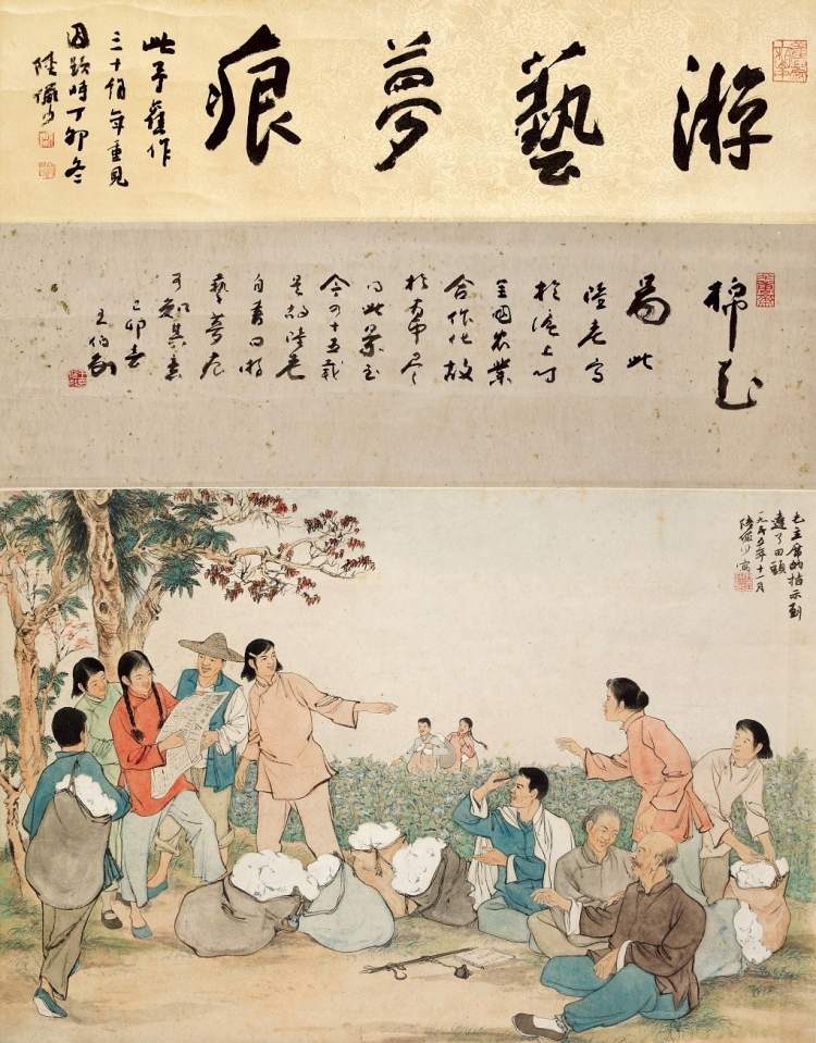 王伯敏题诗堂:棉花图。此陆老写于沪上,时全国农业合作化,故于画中尽得此景,至今四十五载,是故陆老自书曰:“游艺梦痕”,可知其意。己卯春,王伯敏。钤印:王伯敏印、半唐斋