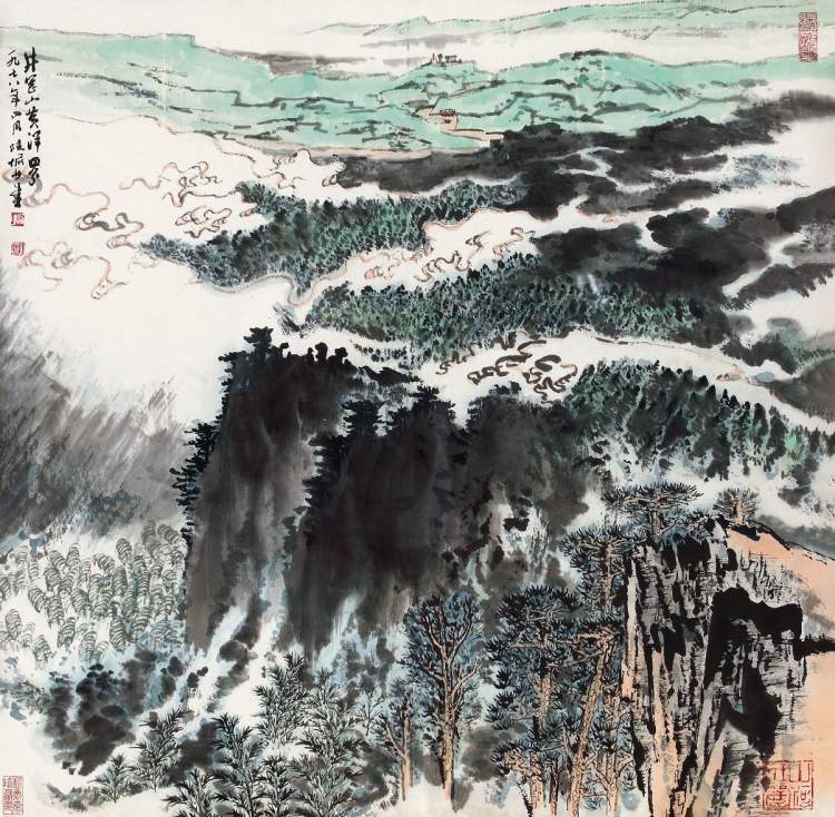 此幅描绘井冈山黄洋界的景致。井冈山是中国共产党领导下创建的第一个武装斗争的根据地,有中国革命“红色摇篮”之称。黄洋界是井冈山五大哨口之一,因弥漫的云雾如同汪洋,一望无际,故又名汪洋界。1977年5月,江西省政府在井冈山筹建革命纪念馆,邀请陆俨少创作大型国画,受上海中国画院的委派,陆俨少在井冈山住了3个多月,体验生活,创作了一批佳作。此幅作于1978年,应为凭记忆所写。