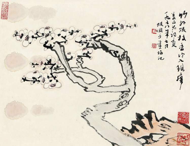 题识:竹外疏枝,香冷入瑶席。姜白石词意,一九七八年七月,陆俨少画梅记。