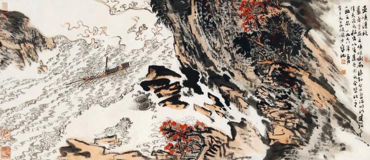 只见画家将目光聚焦于三峡山脚与险滩交汇之处,浓墨、赭石勾画山石,虽不见其耸峙挺拔,但见凝实厚重,江流湍急,滚滚而去,回旋激流,撞击于石壁岩间形成一片片雪白的浪花,秋风穿峡而过,使云浪亦奔涌不息。在波涛急流中,有舟楫逆流而上,我们看到船夫们正奋勇划桨,也似乎能听到他们嘹亮的号子声和畅快的呐喊!观看画卷,即便没有高大的山石,观者的心灵同样被画中湍流所震撼和涤荡。