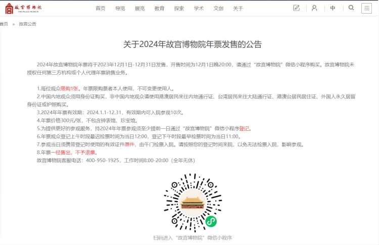 周游天下 | 2024年故宫博物院年票于12月1日至12月31日发售 周到君 2023-11-27 来源:周到上海 据故宫博物院网站消息,2024年故宫博物院年票将于2023年12月1日-12月31日发售,开售时间为12月1日晚20:00。 据悉,2024年年票有效期为2024年1月1日至12月31日,有效期内可入院参观10次,每位观众限购1张,年票价格300元,不包含钟表馆、珍宝馆。 故宫博物院网站截屏 来源:周到上海 作者:周到君 赞一个 (0)