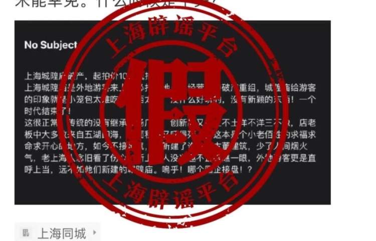 这两天,有自媒体发帖称“上海城隍庙也没有撑住,宣布破产”“网红打卡地也未能幸免”;配图内容也只有几段文字,称“上海城隍庙破产,起拍价10亿流拍”,但没有任何其他证据。这是真的吗?上海辟谣平台核查发现真相是…