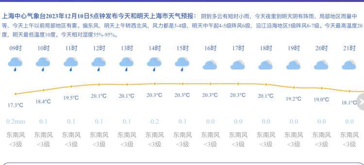 偏东风3-4级,相对湿度在95%-55%。早间气温起步较高,市区16-17℃,预计最高气温20℃,依旧是偏暖湿的体感。今天夜间转为阴有阵雨,晚归的话记得带好雨具。
