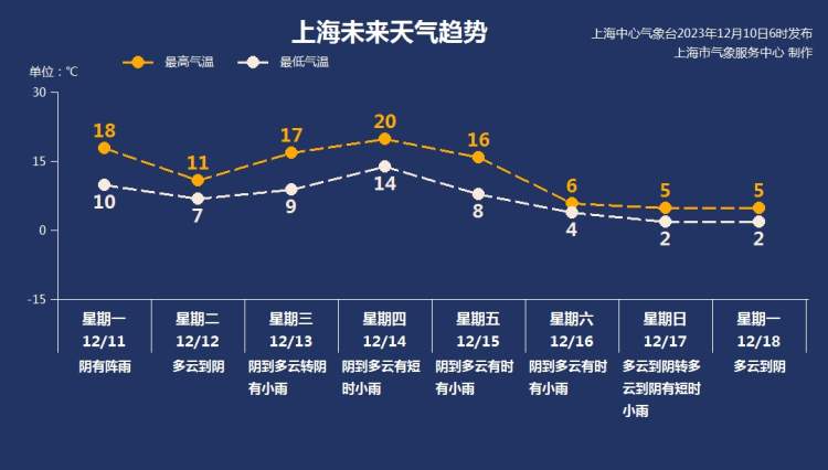 周一白天阵雨天气延续,局部雨量可达中等程度,上班出行注意道路交通安全;周一夜间受南下冷空气影响,雨水渐止,西北风加大至4-5级阵风6级,气温开始下探。“双十二”再现冬日体感,全天在7-11℃。周中暖湿气流卷土重来,小雨常出没,气温再次“飙”到2字头,而气温这轮“颠簸”还将有个高潮收尾,预计下周末会有一股来势汹汹的冷空气到访,届时气温直逼冰点,很有可能触发今年下半年全市首个寒潮预警,或将“助力”上海跨进真正意义上的冬天。