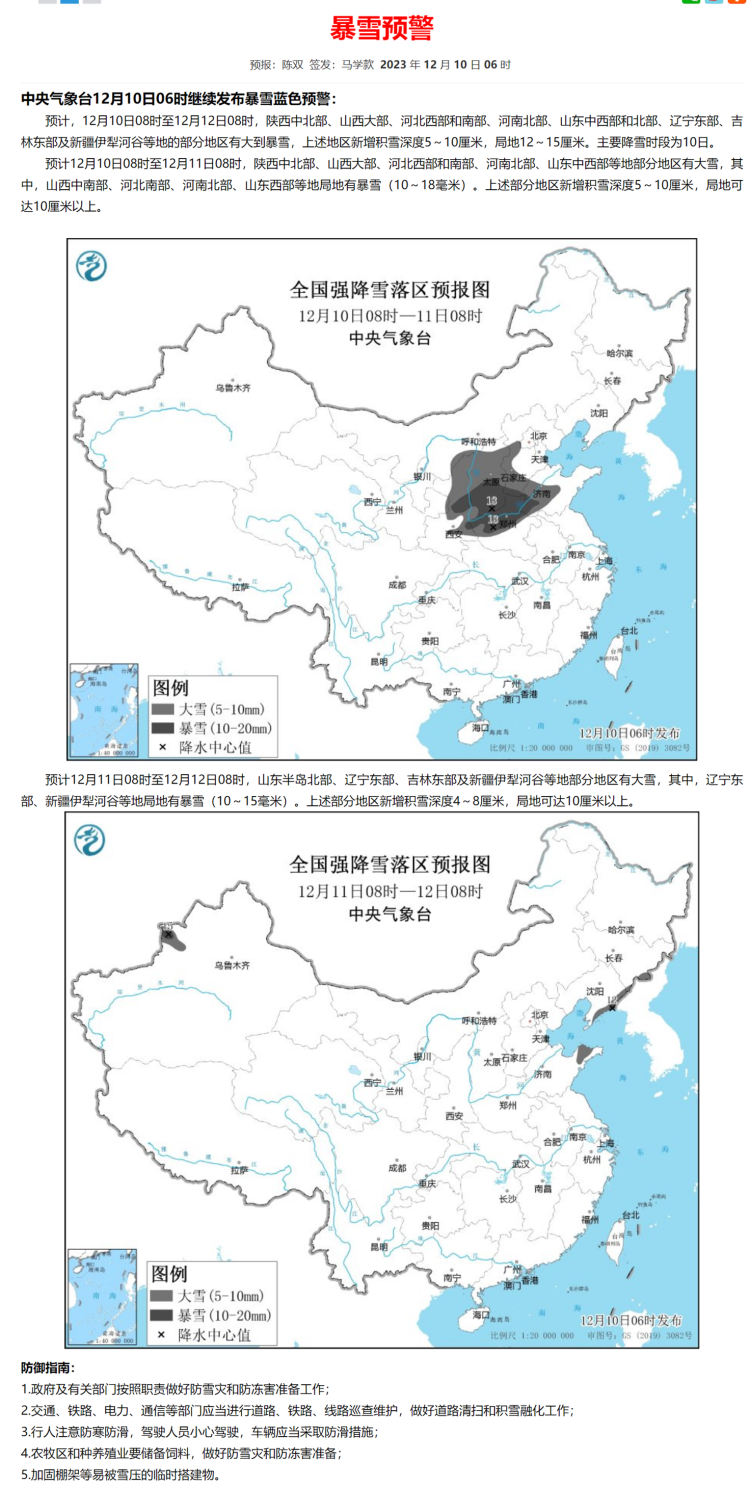 据中央气象台消息,12月10日至11日,中东部地区将出现较大范围的雨雪天气,华北、黄淮地区将迎来今冬首场大范围降雪,其中陕西、山西、河北、河南、山东等地降雪较强,需多加防范。冷空气叠加雨雪影响,今明两天中东部大部地区的气温也将有明显下降,公众需关注气温变化。中央气象台今晨继续发布暴雪蓝色预警及寒潮蓝色预警。