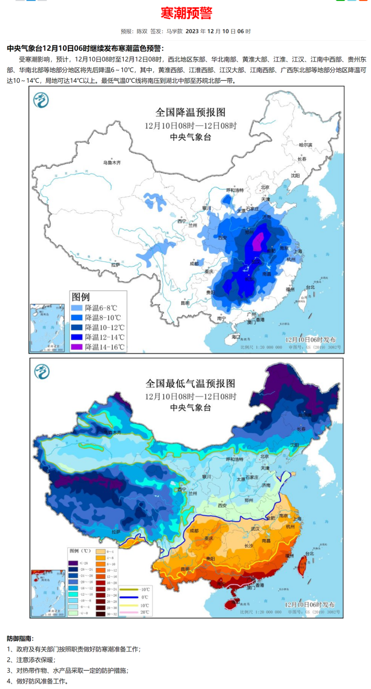 今明两天,寒潮会继续影响我国,预计西北地区东部、华北南部、黄淮大部、江淮、江汉、江南中西部、贵州东部、华南北部等地部分地区将先后出现6~10℃降温,其中,黄淮西部、江淮西部、江汉大部、江南西部、广西东北部等地部分地区降温可达10~14℃,局地可达14℃以上。最低气温0℃线将南压到湖北中部至苏皖北部一带。