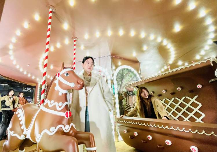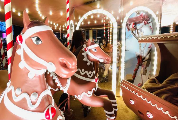 当大家走近新天地时尚I户外广场,就会被【木马奇遇游】飘散出的醇厚奶油香气吸引。寻着香气走近,映入眼帘的是一个谐趣的姜饼人与染上姜饼色的圣诞树作伴,姜饼人的身旁闪耀着一座缤纷璀璨的旋转木马。