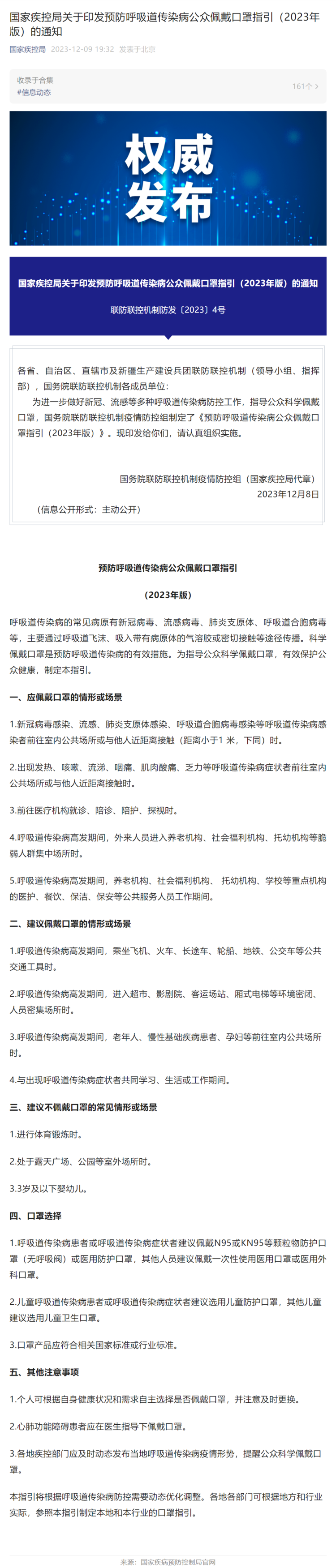 本指引将根据呼吸道传染病防控需要动态优化调整。各地各部门可根据地方和行业实际,参照本指引制定本地和本行业的口罩指引。