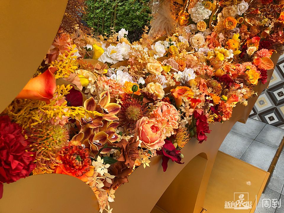 据策划方介绍,这件作品名称叫《法桐叶》,由景观艺术家香存创作。装置以法国梧桐叶片轮廓为创作蓝本,通过逐层缩小叠加,形成具有透视效果的立体装置。正面每一层之间的间隙用花卉和灯带装饰,四层喻义一年四季的时光变幻,灯带突出叶片的层次感,金色为其主基调,从外围向中心由红色、橙色、黄色、白色渐变,中间的法桐叶形镂空部分表达了对未来的展望。背面为一整面植物装饰,以垂顺感的植物组合形成飘逸浪漫的氛围。