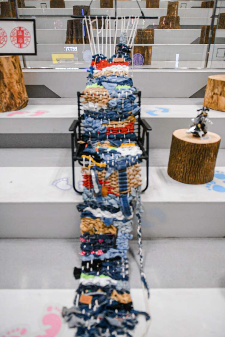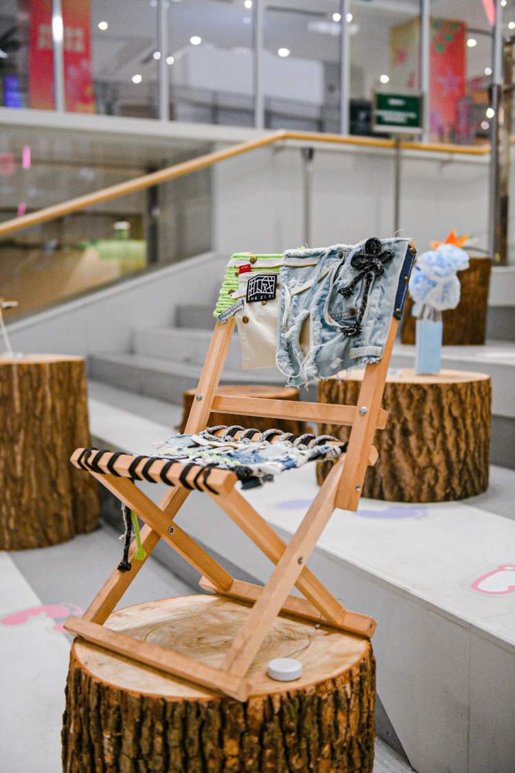 当天,可持续品牌“折子戏”主理人、艺术装置创作者,可持续workshop研发、导师BOBO潘也将带来自己的这些年尝试用一些废弃和环保纸张等制作的展品——使用户外折叠椅、棉绳、向邻里募集的旧牛仔衣物,用最简单的编织手法发挥创意制作,衣物在铺满折叠椅后开始向外自由扩张,从原本普通的折叠椅,转变成人与人之间的善意生根发芽自由生长的美好见证。