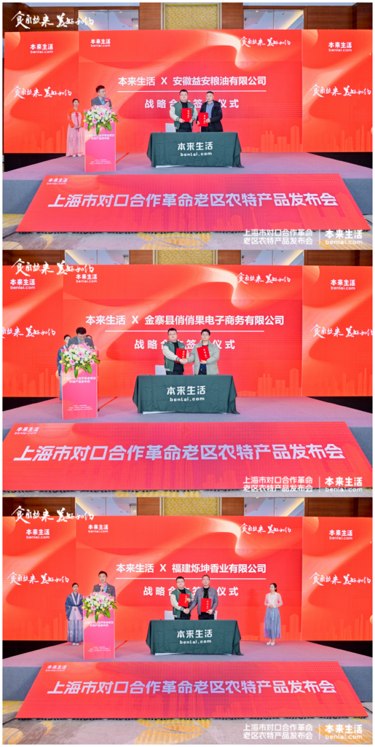 发布会上,本来生活分别与金寨县俏俏果电子商务有限公司、安徽益安粮油有限公司、福建烁坤香业有限公司签署合作协议。更多来自对口合作地区的品质好物将通过本来生活线上渠道走进上海、走向全国。未来,本来生活将继续发挥自身贴近消费端、了解市场需求的优势,助力对口帮扶及合作地区农特产品拓市场、增销路,丰富城市家庭餐桌。