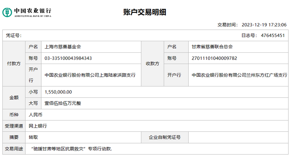 (4)银行转账(汇款时请注明:用于"驰援甘肃"字样)