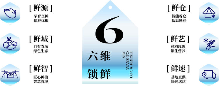 “六维锁鲜”是光明农发集团依托独有的全产业链优势,聚焦鲜源、鲜域、鲜智、鲜仓、鲜艺、鲜速六个方面,创新性整合的鲜米锁鲜技术体系,通过自主研发优质稻种,更适合上海市民的口味,锁定种源新鲜。
