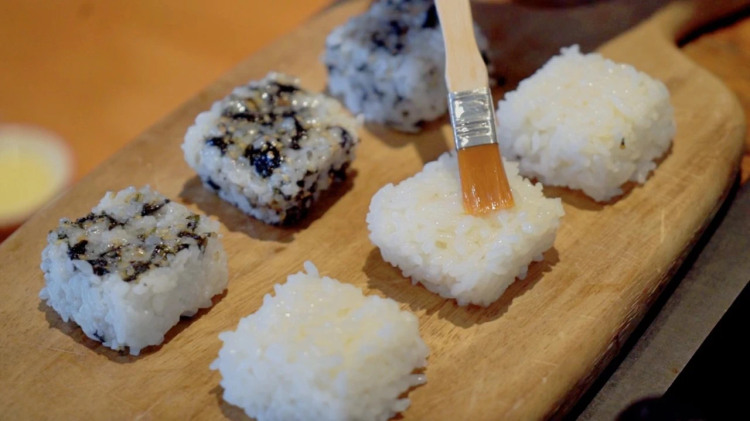 谈笑间,两人就用刚煮好的松江大米做了可口的烤饭团,