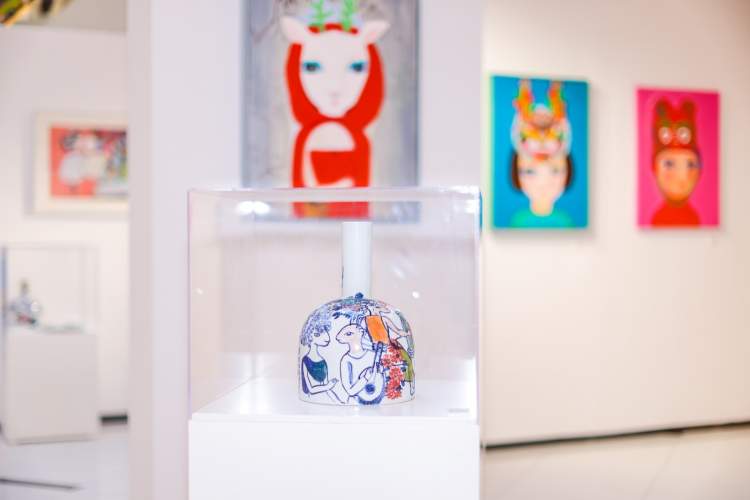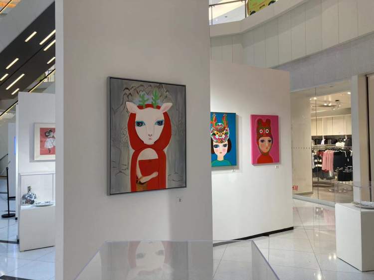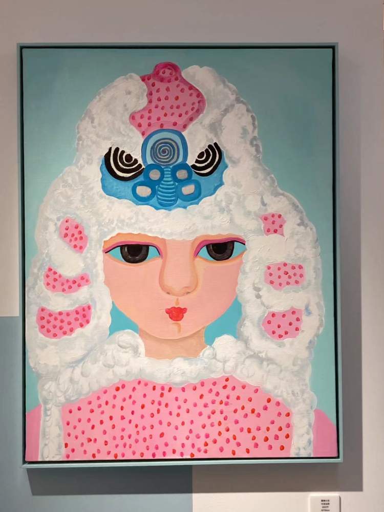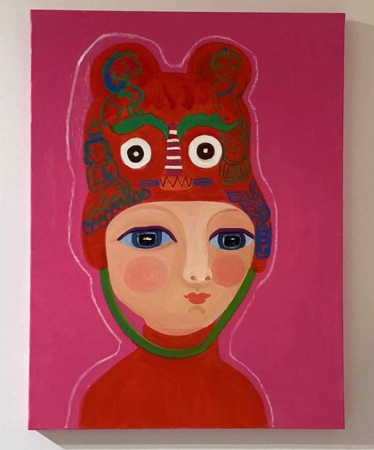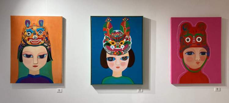 展览中还有一个“日有万喜”系列,画中鹿女孩都戴上了各式虎头帽,让古老的民俗文化充满了少女童话感。