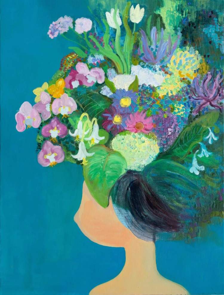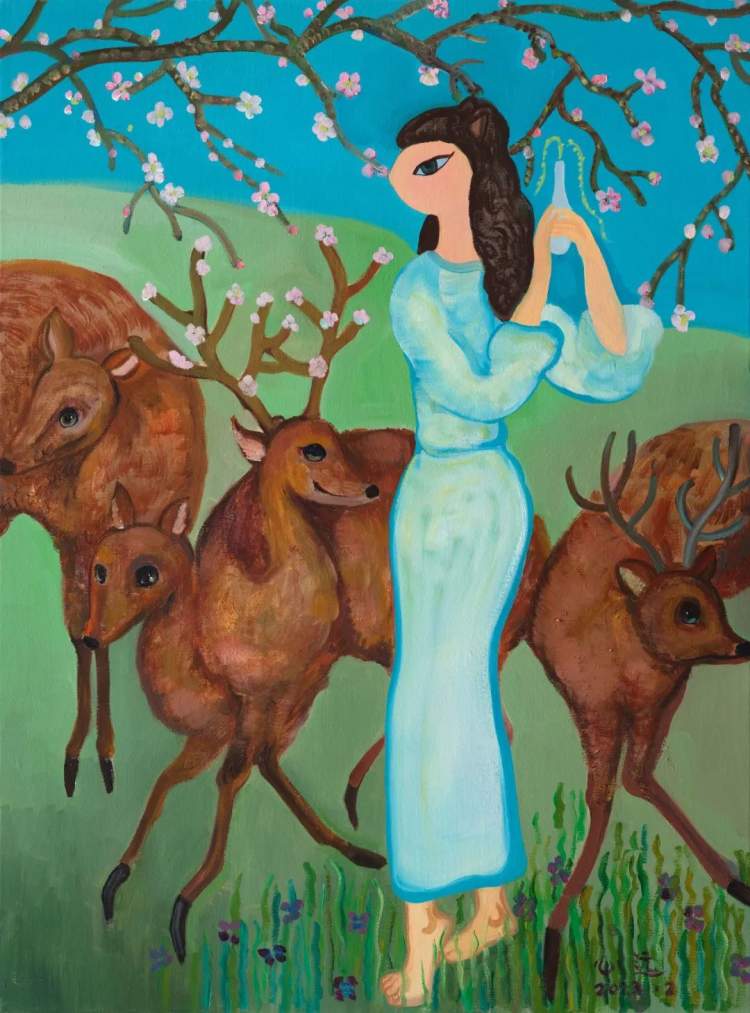 杨心远的作品中,总是有一头鹿,这成为她作品的标志性元素,杨心远通过“花之于鹿”系列作品,以鹿喻人,折射出她对都市女性的心灵洞察。