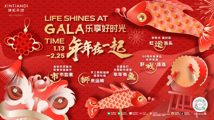 即日起 ,瑞虹天地【LIFE SHINES AT GALA TIME年年在一起】春节主题活动正式拉开序幕,以传统民俗元素为核心营造浓厚年味氛围,携手“艾格吃饱了”举办上海必逛年货集市,近百场年俗演出打造全家人过年好去处。