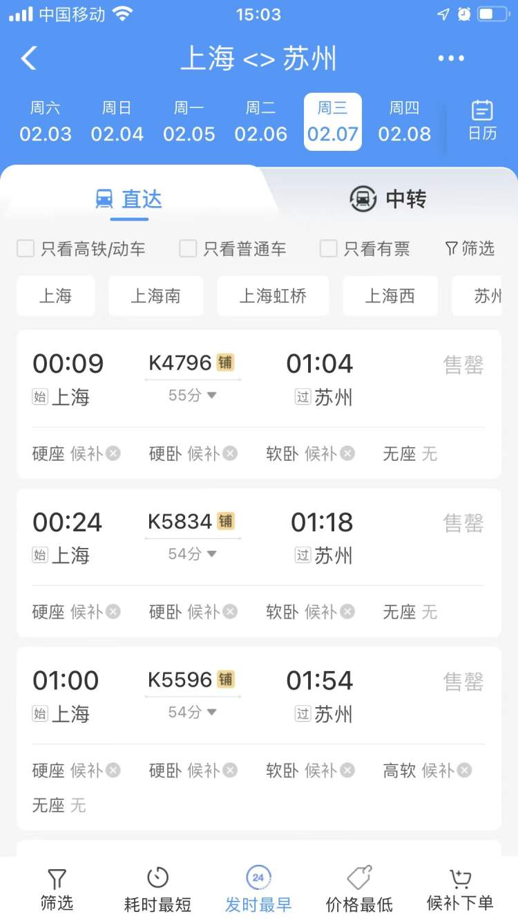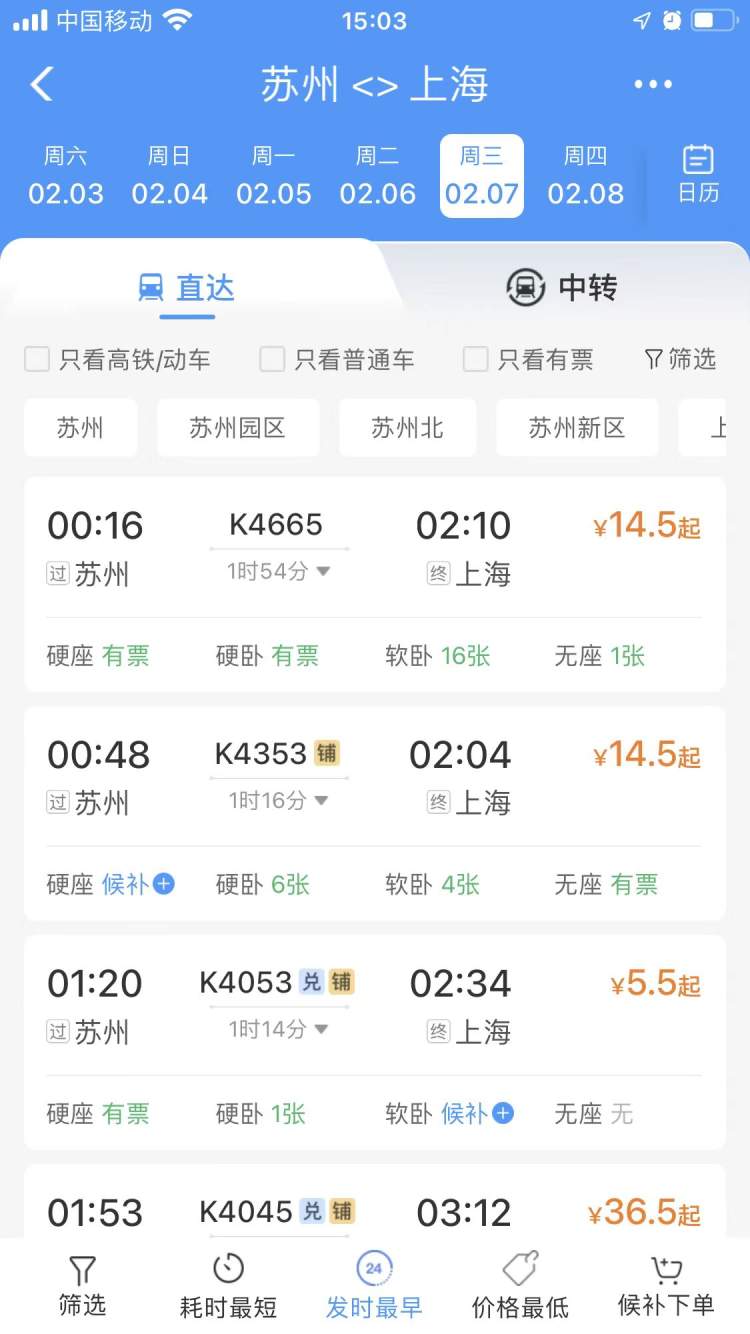 当然,苏州到上海实在太近了,火车出行的需求少,所以才有折扣票。反过来,上海到苏州的票就不那么好买了。比如,2月7日上海至苏州的绝大部分车次已经售罄,但苏州到上海的车却车票充裕。