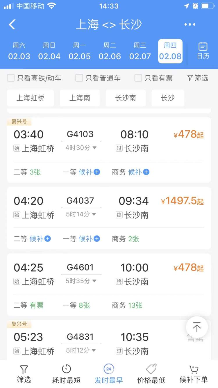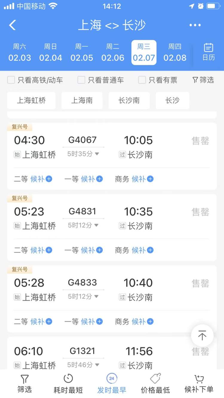 2月7日,上海至长沙售罄的部分班次