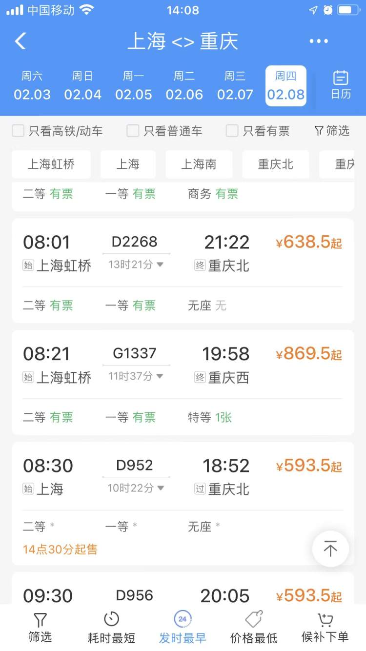 2月8日,上海至重庆有票