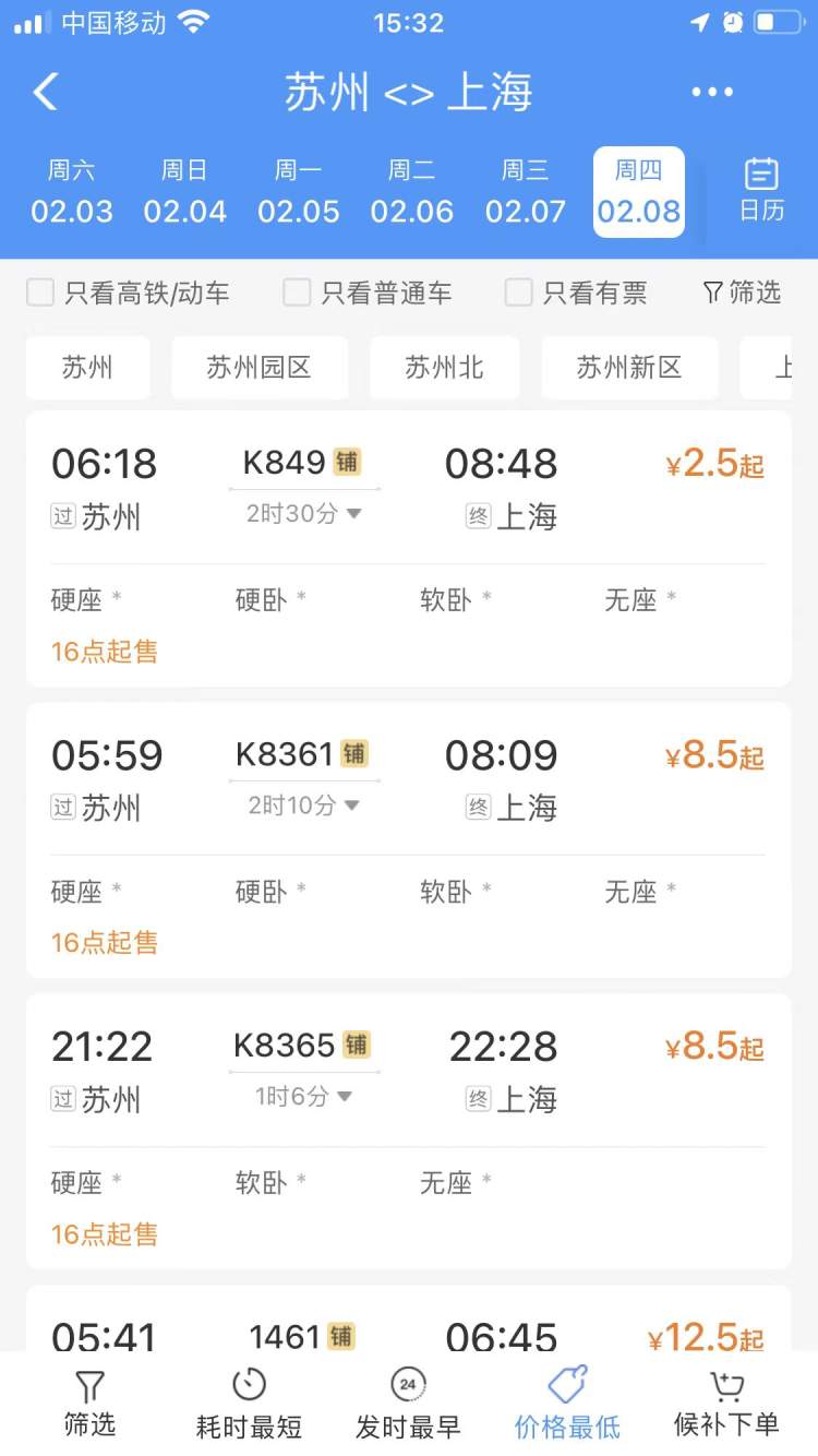 这班2.5元的车是早上6点18分从苏州出发的K849次,其硬座和无座的票价都是2.5元,是原价的1.8折,乘车时间为2个半小时,8点48分抵达上海站。