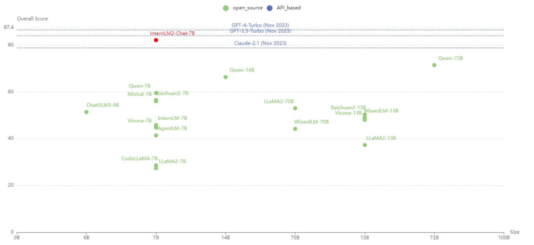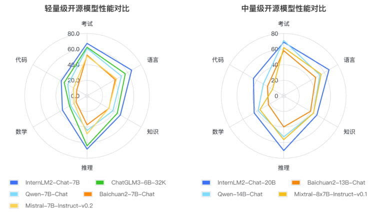 InternLM2的轻量级及中量级版本性能在同量级开源模型中表现优异