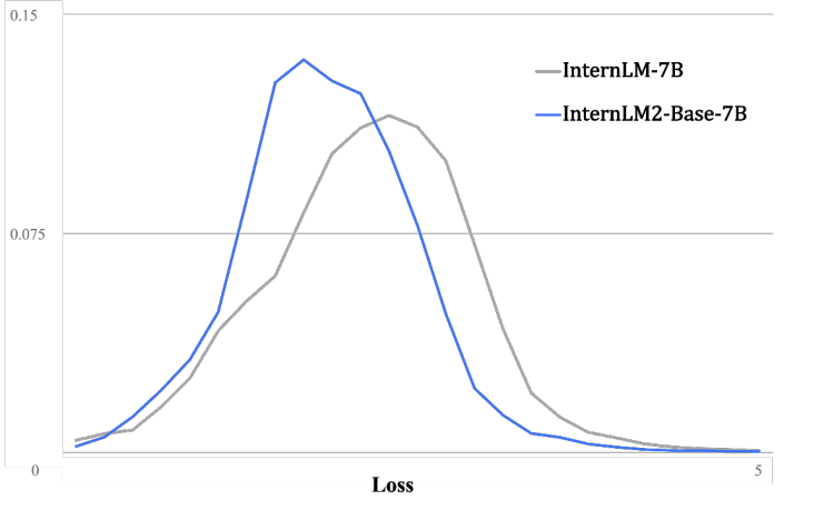 与第一代InternLM相比,InternLM2在大规模高质量的验证语料上的Loss分布整体左移,表明了其语言建模能力的实质性增强
