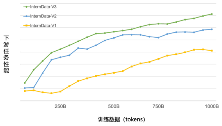 目前,InternLM背后的数据清洗过滤技术已经历三轮迭代升级,仅使用约60%的训练数据即可达到使用第二代数据训练1T token的性能表现,模型训练效率大幅提升。
