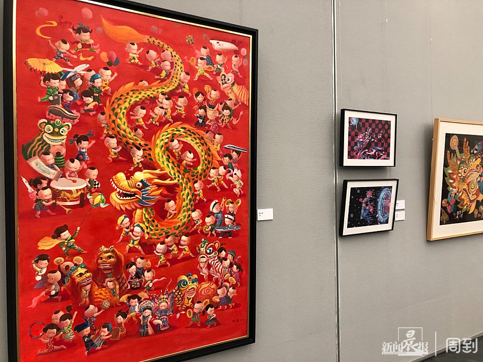 上海大学上海美术学院教师、硕士生导师刘昕的《龙生肖》位于一楼大厅内,作品色彩非常醒目,他从去年12月就开始创作“海派龙”系列,而《龙生肖》是其中的一张作品,刘昕向记者介绍了他创作的思路: