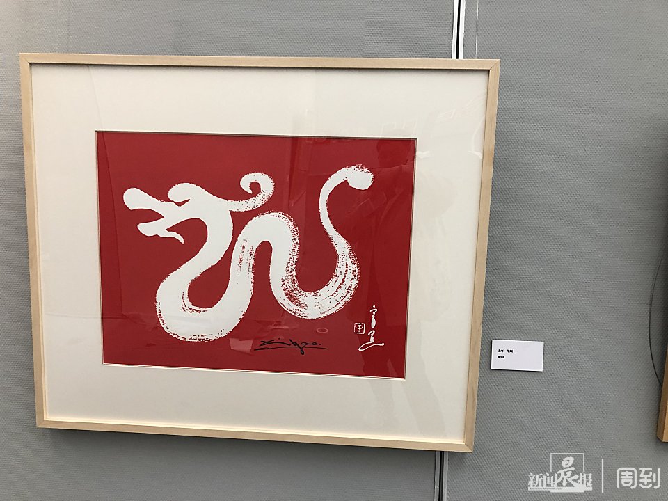 在上图东馆一号展厅,记者看到了郑辛遥、李守白和黄阿忠等名家的特邀作品。上海市文联副主席、上海美协主席郑辛遥向记者介绍了自己的这幅《龙年一笔顺》作品: