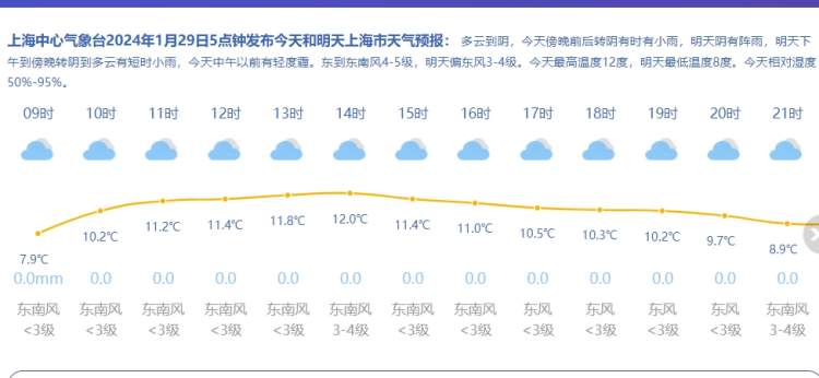 今天云量逐渐增多,阳光成为稀罕物,傍晚前后转为阴有时有小雨,今天中午以前有轻度霾。气温继续回升,早晨最低气温市区徐家汇站4℃附近,部分郊区在-2℃至0℃,预计白天最高气温在12℃附近。东到东南风4~5级,相对湿度增大至95%~50%。