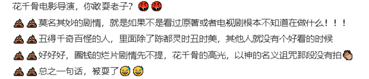 对比当年剧版的红火,影版《花千骨》扑得惨烈:上映7天,票房不过500万元出头。无论是导演含泪道歉、制片人发长文聊情怀,还是当年剧版的演员们的帮忙吆喝,一切营销上的努力都改变不了观众对该片的观感。所谓仙侠大片,不仅制作稀烂,连原本多少有些吸引人的剧情都被拍得相当敷衍,进电影院看着实是受罪了。