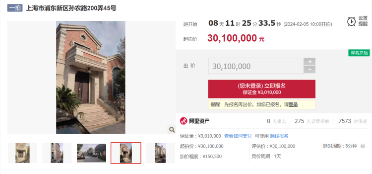 上海市浦东新区孙农路200弄45号房产,建筑面积377.41平方米,起拍价3010万元,保证金301万元,增价幅度15.05万元,将于2月5日开拍。目前已经吸引了7000多人次围观,近300人设置提醒。