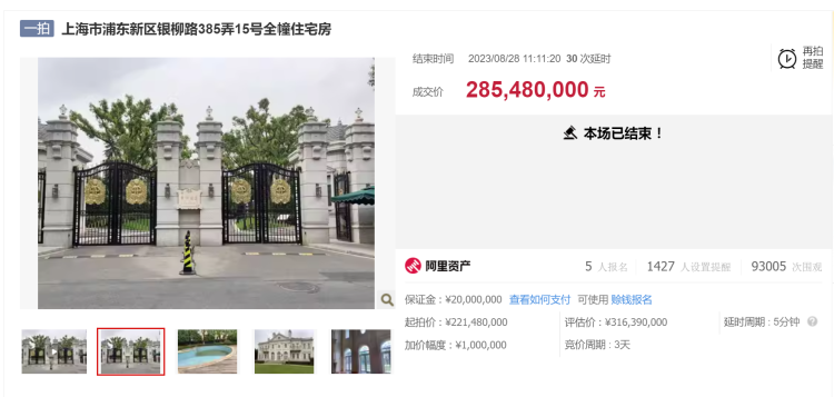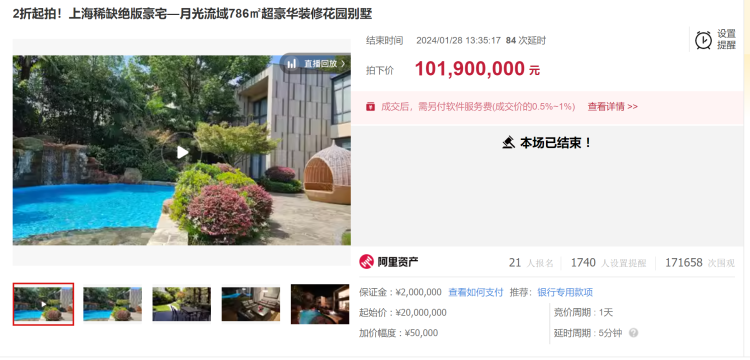 1月28日下午,上海月光流域786平方米花园别墅,以2000万元2折低价起拍,吸引围观17.15万人次,1739人设置提醒,21人报名,123次出价,最终以1.019亿元成交!溢价率达409.5%,引发市场热议!