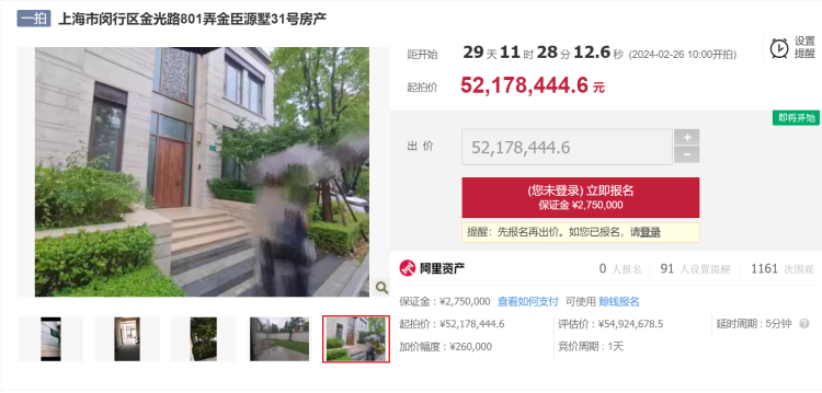 目前,阿里资产平台多套上海高端住宅已上架即将开拍,能够满足改善型家庭置业需求。如上海市闵行区金光路801弄金臣源墅31号房产,建筑面积676.15平方米,评估价5492万元,起拍价5217万元,将于2月26日开拍。