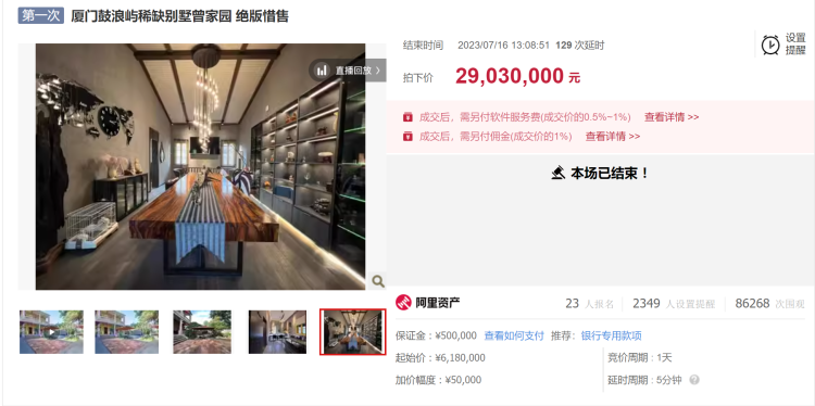 基于阿里资产的平台优势,全国已有多个高端住宅溢价成交。比如厦门鼓浪屿稀缺别墅曾家园,起拍价为618万元,起拍单价约2.21万元/平方米。曾家园是鼓浪屿仅剩不多的可交易的带庭院独栋百年别墅,极具稀缺性和收藏价值。于去年7月15日上午10时起开始进入拍卖流程,原定于7月16日10点结束,由于不断有买家进场,拍卖经过129次延时,于7月16日13点08分才结束,整个拍卖历时27个小时,围观人数也创下拍卖新高。最终曾家园别墅吸引了23位买家,超8万人围观,238轮竞价,以总价2903万元成交,溢价率高达469.74%,成交单价103645元/平方米。