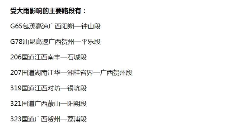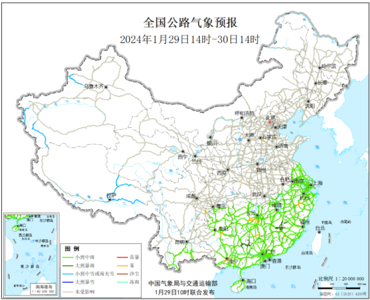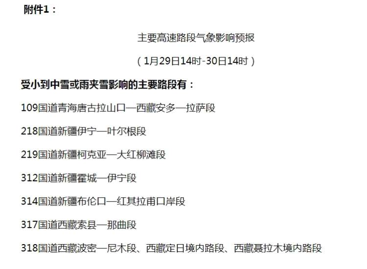 预计29日14时至30日14时,新疆伊犁河谷和南疆西部山区、西藏北部和东部等地部分道路受小到中雪或雨夹雪影响;江南大部、贵州东南部、华南等地部分道路受小到中雨影响,其中,江西东部、广西东北部部分道路受大雨影响。另外,河北南部、河南西南部、湖北西北部、浙江中部、福建南部、湖南中南部、四川东南部、贵州东南部、广西中部等地局部道路受雾影响能见度低。