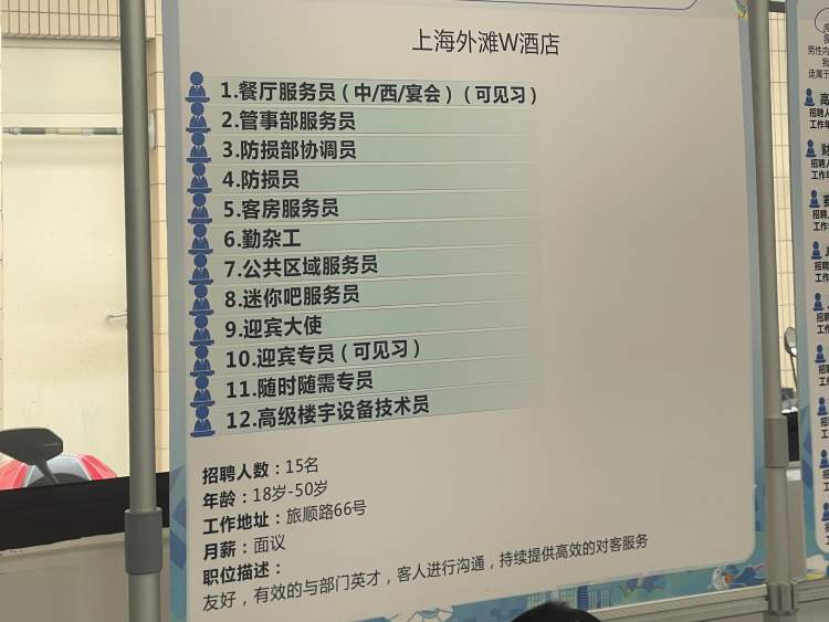 其中,外滩W酒店摊位前人头攒动,不仅因其提供见习岗位,还因招聘的年龄范围设在了18-50岁,体现了包容性。外滩W酒店现场招聘人员告诉记者,她对一位40多岁的求职者印象深刻。这位求职者是酒店管理专业出身且在20岁后在酒店行业从事多年,后因职业规划改变,在30后离开酒店行业至今。双方经现场沟通后初步达成意向。