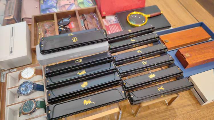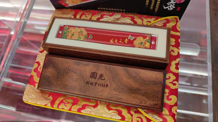 除了祥龙款,国光口琴已经集齐了十二生肖。此外,还有喜气洋洋、颜值颇高的“花好月圆”口琴,这款口琴的盒子还是纯红木打造,充满质感。