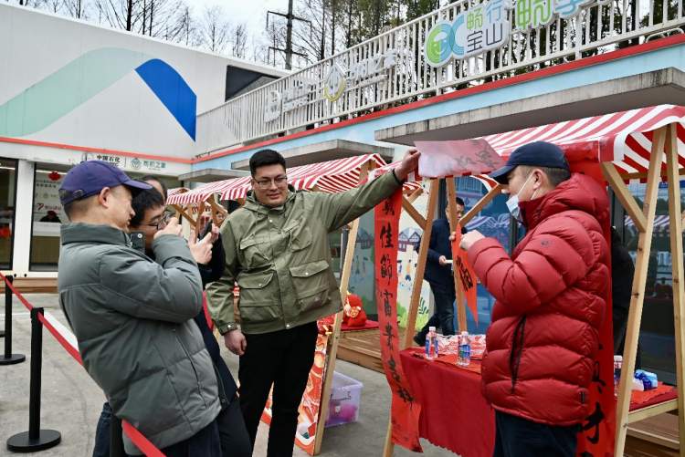 驿站里,拼起的长条桌上,来自杨行镇党群服务中心的书法爱好者挥毫泼墨、红纸翻飞,一副副散发着清新墨香的精致春联跃然纸上,志愿者们将寄托着美好愿景的春联送到卡车司机手中。