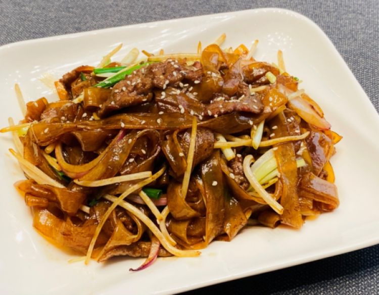 干炒牛河是粤菜中的一道经典小吃,主料是河粉,配料有牛肉片、豆芽、韭黄等,旺火快炒,一定要用铁锅,现炒现吃,才能体现粤菜的镬气,镬气是粤菜的灵魂。