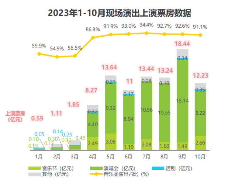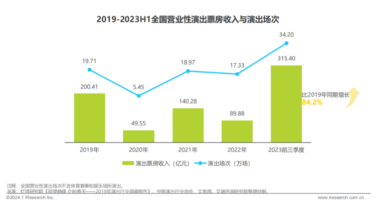 根据艾瑞咨询最新发布的《2023中国演出票务行业研究报告》,去年前三季度,全国营业性演出实现票房收入315.40亿元,相较于疫情前的2019年同期,增幅达84.2%,且已超过2019年200.41亿元的全年票房收入。