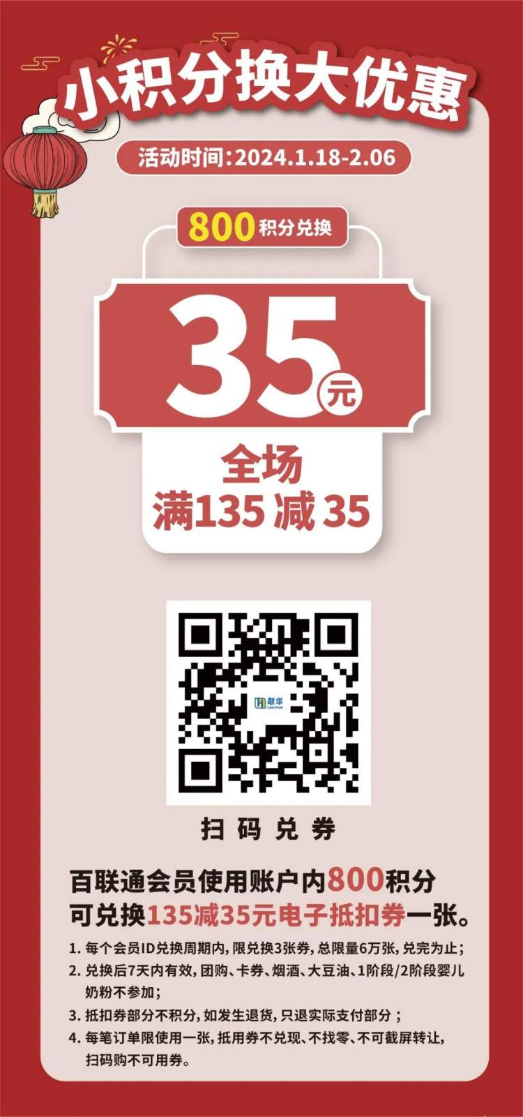 这么一套送礼连招,来联华一站式购齐,同时还有一波优惠:即日起至2月6日,百联通会员使用账户内800积分就可兑换全场满135减35元电子抵扣券一张。(详情请见商场公告)
