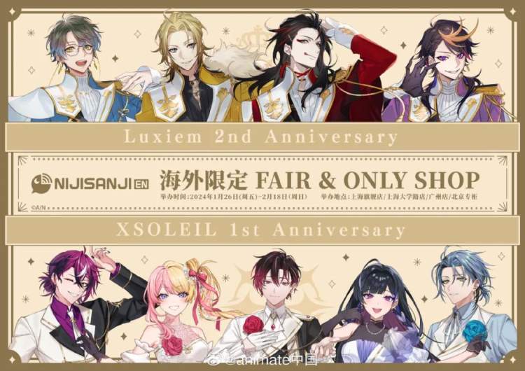 同时,NIJISANJI EN Luxiem 2nd Anniversary、XSOLEIL 1st Anniversary ,海外限定 FAIR & ONLY SHOP也已开启,即日起至2月18日,购买相关商品每满100元即可随机获得海外限定特典迷你卡牌1枚。