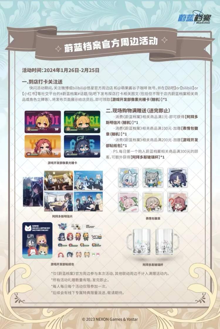 蔚蓝档案官方周边活动开启,即日起至2月25日,关注➕打卡即赠游戏开发部像素光栅卡,现场还有3档购物满赠活动。